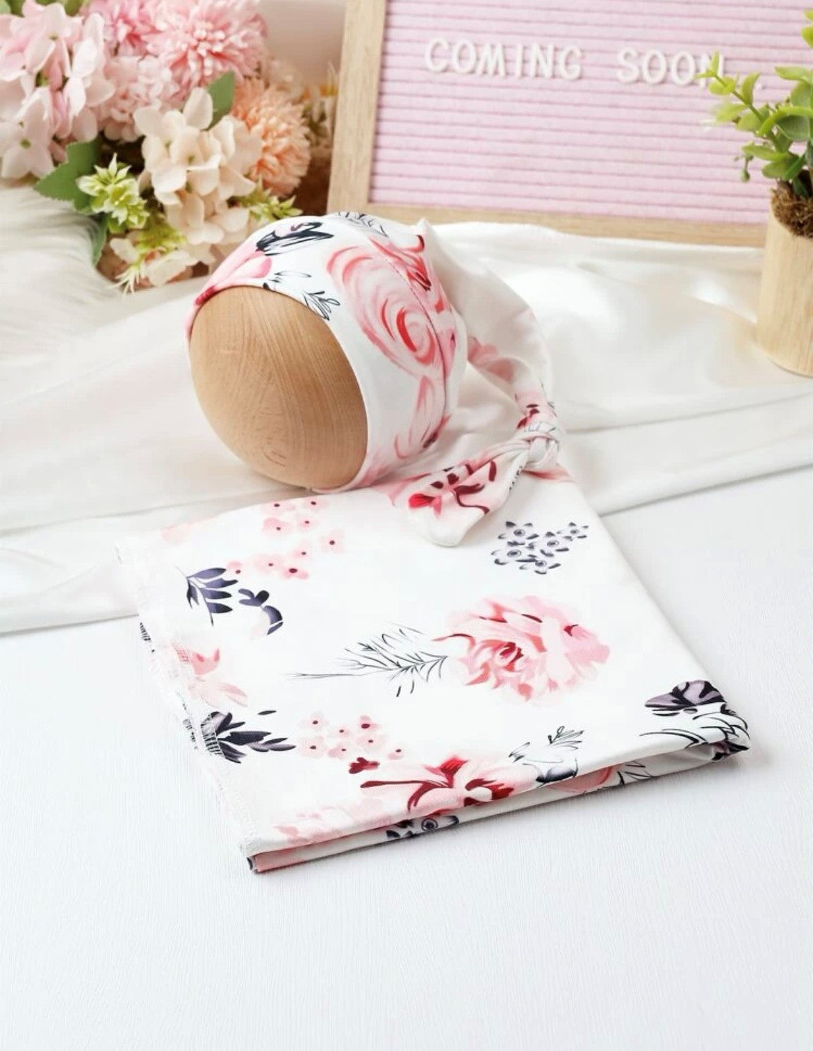 Our Nava Baby cotton jersey wrap with matching beanie is soft, snuggly and stretches with baby. Our 'Peonie Pretty' design is a beautiful floral print on a soft white background.
