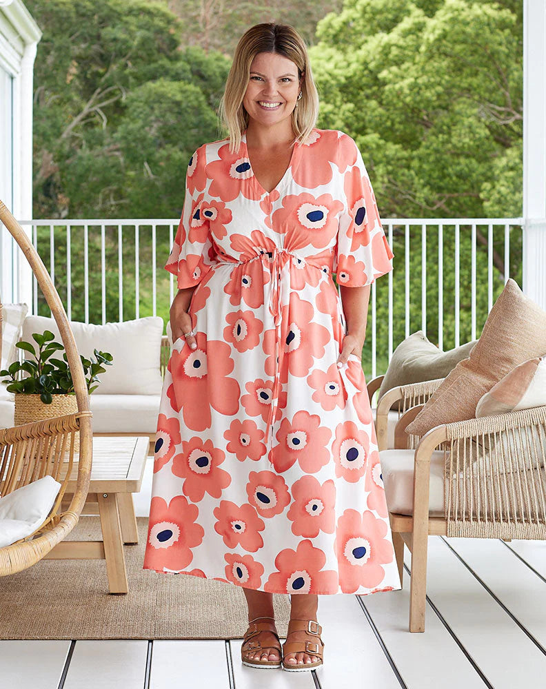 Introducing the Valerie Dress, ready to set the tone for your summer social season! This sensational piece embraces a divine peach floral print, accentuated by shades of white and navy blue. Crafted from 100% rayon, it's both flowing and figure-flattering. Adorned with a stylish V neck and chic flutter sleeves, this midi-length stunner features an elasticated high waist seam with a tie detail for added flair. With the convenience of pockets, this versatile dress can be styled casually with sandals or elegantly elevated with heels for any occasion!